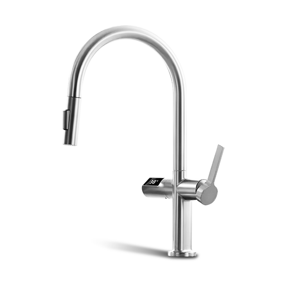 Dive into the Future of Faucets with Kanzen KHF-102. Our meticulously crafted digital faucet transcends the ordinary, offering a revolutionary blend of high-tech features and a design that redefines opulence in the heart of your kitchen or bathroom. KHF-102 is not merely a fixture, it's a masterpiece that seamlessly integrates cutting-edge technology with the epitome of luxurious design, setting a new standard for sophistication. Elevate your daily rituals and redefine your space with the perfect blend of innovation and style with temperature control, air sensor for main switch, hot/cold system, LED display and pull-out faucet. It is designed for a hassle-free installation, suitable for both DIY enthusiasts and professional setups. The simplicity of installation complements the overall user-friendly experience. The architectural elegance of its clean lines and modern forms transforms your space into a sanctuary of luxury, where every detail is meticulously crafted for aesthetic perfection.